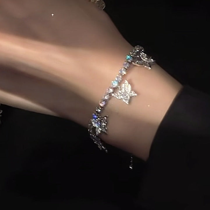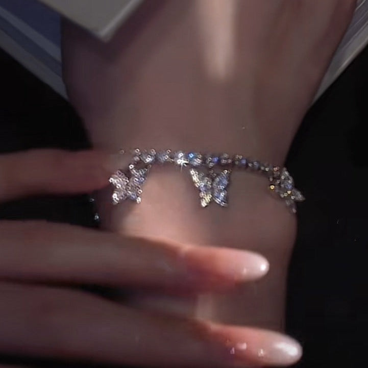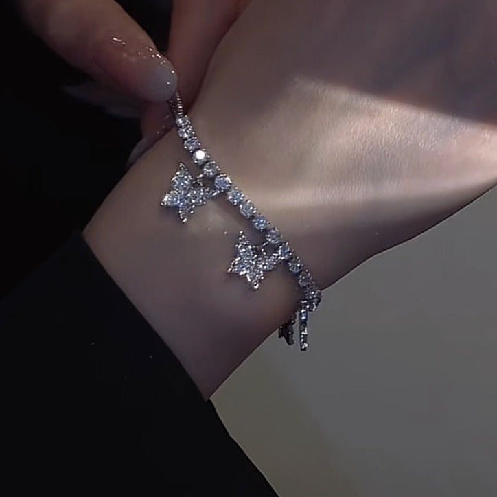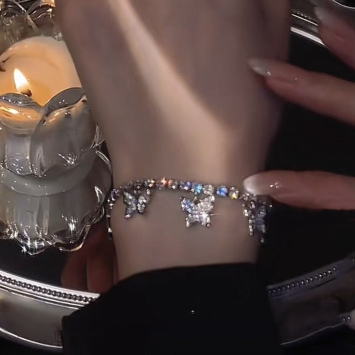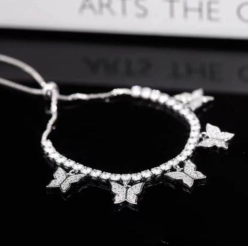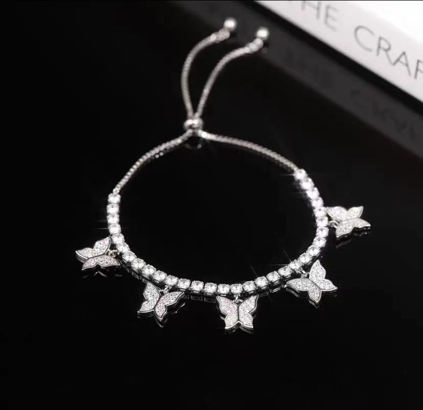 Das mit Zirkonia besetzte Schmetterlingsarmband ist ein Schmuckstück, das das Handgelenk schmückt. Es besteht aus mehreren kleinen Zirkonia-Kristallsteinen, die auf einem schmetterlingsförmigen Metall eingearbeitet sind. Zirkonia ist ein künstlicher Kristall und wird üblicherweise als Ersatz für Diamanten verwendet, da er wie ein echter Diamant aussieht, aber erschwinglicher ist. Das schmetterlingsförmige Design verleiht dem Armband ein leichtes und zartes Aussehen, das sich gut mit verschiedenen Kleidungsstilen kombinieren lässt. Dieses Armband ist in der Regel eines der beliebtesten Accessoires für Frauen und kann sowohl im Alltag als auch zu besonderen Anlässen getragen werden.