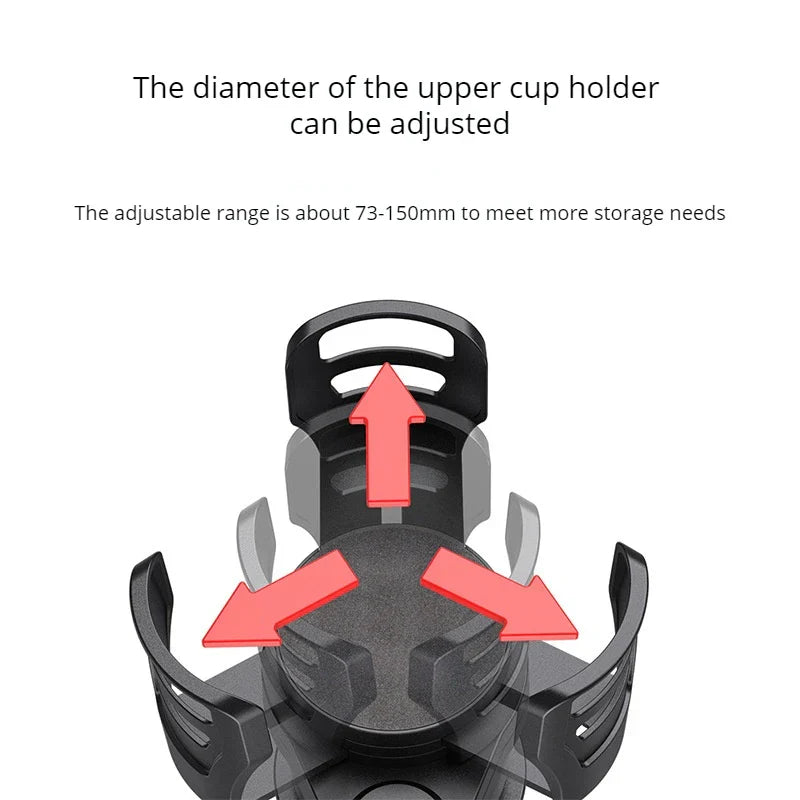 ● Verstellbare Größe: Der Durchmesser des oberen Becherhalters kann in der Größe von 73-150 mm eingestellt werden, um mehr Stauraum zu bieten. Der Durchmesser der verstellbaren Basis beträgt 66-100 mm, und ein rutschfester Silikonstreifen ist am Rand des festen Schlüssels angebracht.