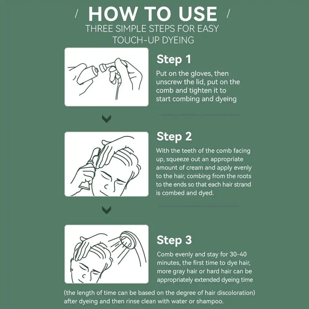 ● Schritt 2: Drücken Sie die Haartönung heraus und verteilen Sie sie gleichmäßig im Haar, während Sie sanft von der Wurzel bis zu den Spitzen kämmen, um sicherzustellen, dass jeder Haarstrang gekämmt und gefärbt wird. Die Zähne des Kamms sollten nach oben zeigen.