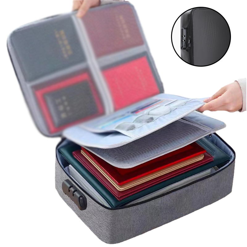 Schützen Sie Ihre wertvollen Unterlagen mit der feuerfesten und wasserfesten, abschließbaren Dokumentenaufbewahrungstasche. Genießen Sie den schnellen Zugang und die strukturierte Aufbewahrung, während Sie sicherstellen, dass Ihre wichtigen Informationen vor Feuer, Feuchtigkeit und Wasser geschützt sind.