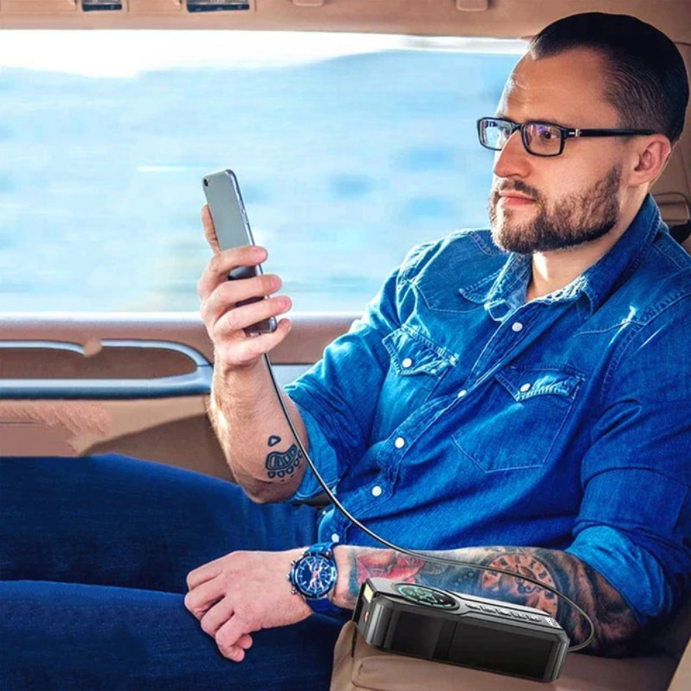 Seien Sie für jede Panne gerüstet mit dieser vielseitigen Auto-Luftpumpe, die Starthilfe und Powerbank in einem kompakten Gerät vereint. Ideal bei platten Reifen oder Batterieproblemen – die schnelle Reifeninflation in nur drei Minuten bringt Sie sicher und zügig wieder auf die Straße.
